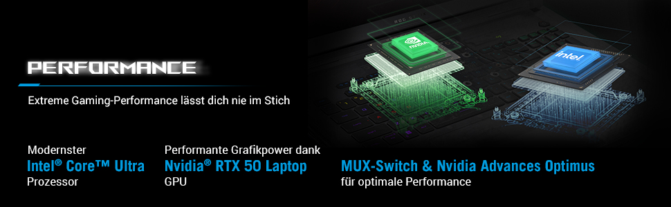 Maximale GamingpowerFür Gamer mit höchsten Ansprüchen an Bewegungsschärfe und Bildqualität ist das Strix SCAR 16 ein Meisterwerk der Technik. Ausgestattet mit einem 16 Zoll 2,5K Mini-LED Display, bietet es Dir eine herausragende visuelle Klarheit, sodass Du Deine Gegner besser erkennen kannst. Angetrieben wird es vom modernsten Intel® Core Ultra HX Prozessor und einer NVIDIA® GeForce RTX Notebook-GPU der neuesten Generation mit einer maximalen TGP von 175W. Hinzu kommt die extra Beschleunigung durch den Intel® AI Boost. Diese Kombination sorgt dafür, dass das Strix SCAR 16 selbst die anspruchsvollsten AAA-Spiele mühelos bewältigt. Zusätzlich verfügt es über einen dedizierten MUX-Switch mit Unterstützung für NVIDIA Advanced Optimus. Mit NVIDIA® Advanced Optimus kann das Notebook automatisch zwischen der leistungsstarken Grafikkarte und der stromsparenden integrierten GPU umschalten und erweitert damit die Akkulaufzeit. Der DDR5-Arbeitsspeicher sorgt für maximale Performance bei jedem Spiel und die PCIe Gen4x4-SSD bietet Dir ausreichend Speicherplatz für Deine Spiele, Bilder und Videos.